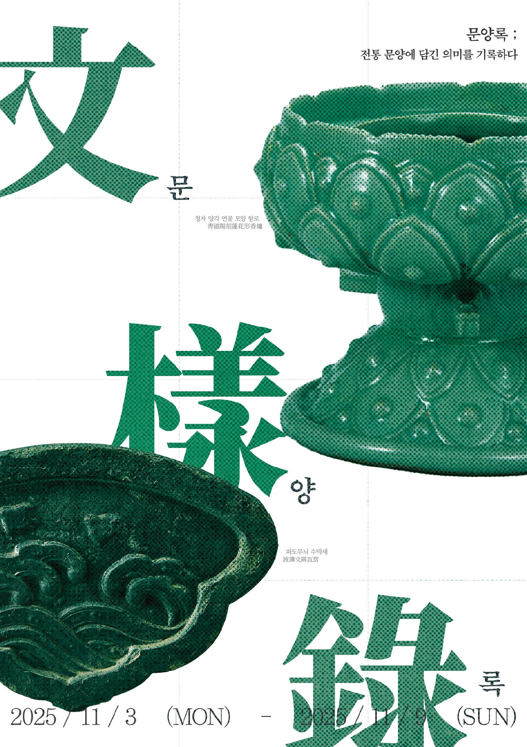 <문양록>은 우리나라 전통문양과 자수에 대한 의미를 알아볼 수 있는 웹페이지 입니다. 공예품, 수막새, 한복 총 세 개의 카테고리로 나뉘어져 있고, 각 카테고리 페이지에서 다양한 유물에 대한 이야기도 만나볼 수 있습니다. 시대를 초월하여 이어진 문양과 자수가 들려주는 이야기를 들어보세요.