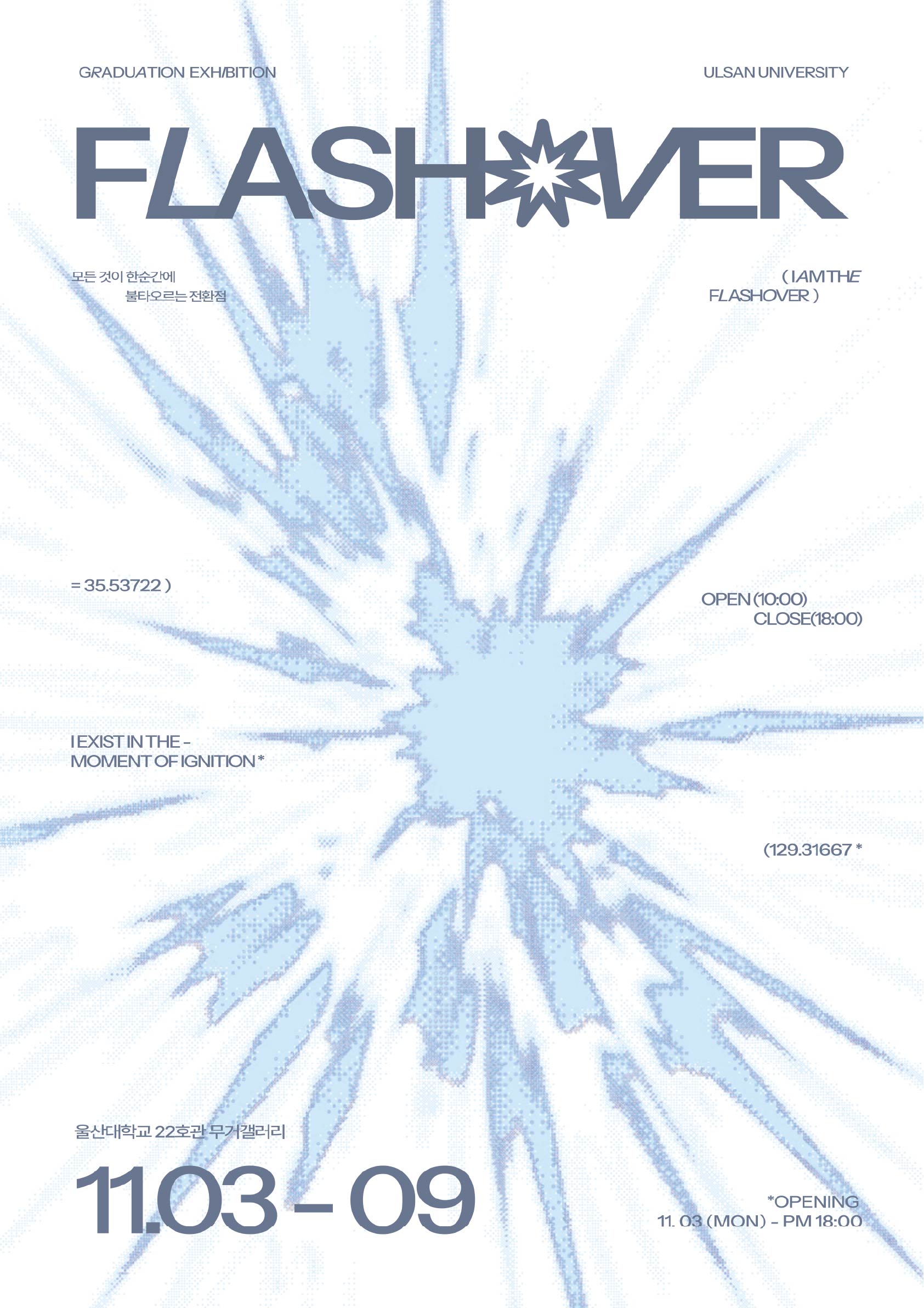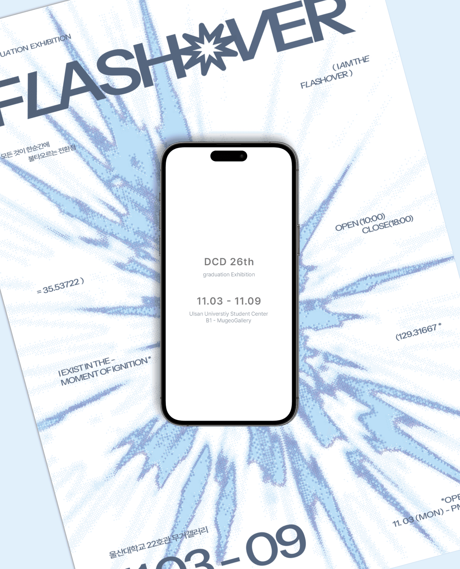<FLASHOVER>는 제26회 디지털콘텐츠디자인학과 전공 학생들의 졸업 전시 작품을 소개하고 감상할 수 있는 웹페이지입니다.