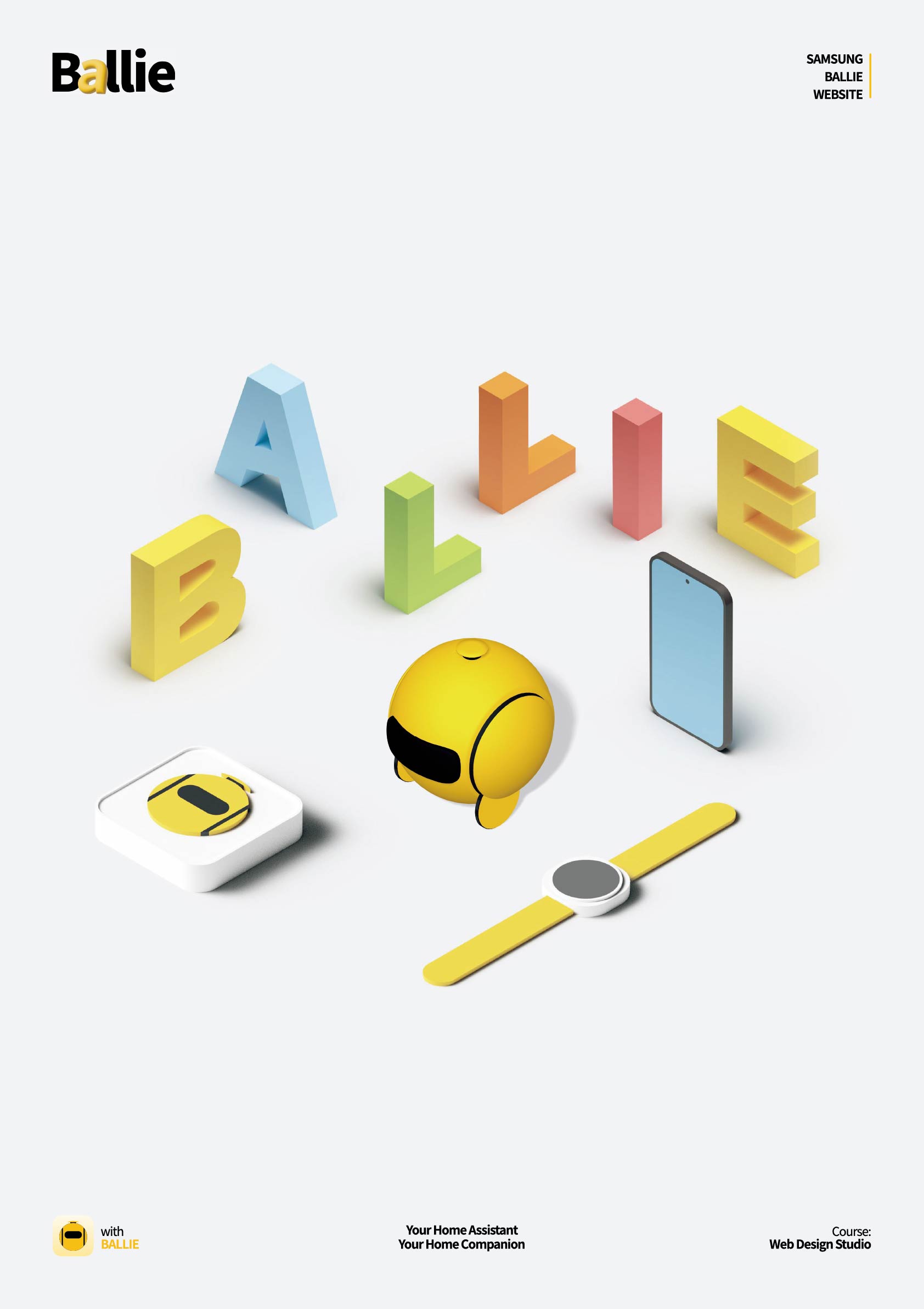 <Ballie>는 2024년에 삼성 프레스 컨퍼런스에서 공개된 AI 컴패니언입니다. ‘Ballie’ 공식 소개 채널이 부재한 상황 속에서, ‘Ballie’의 디자인 특징과 핵심 기능을 소개하고 사용자가 이를 쉽게 활용하는 방법을 안내하기 위해 제작된 웹사이트입니다.